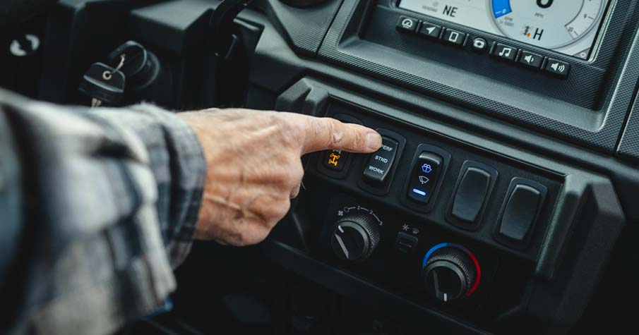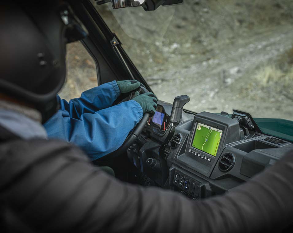 - 7” Display Powered by RIDE COMMAND: Plow Mode, Group Ride, GPS Navigation, Bluetooth, AM/FM Radio; Factory Rear Camera; Dual-sweep Analog Dials w/ 4" LCD Rider Information Center: User Selectable Blue/Red Backlighting & Brightness, Programmable Service Intervals, Speedometer, Tachometer, Odometer, Tripmeter, Clock, Hour Meter, Gear Indicator, Fuel Gauge, Coolant Temperature, Voltmeter, Service Indicator and Codes, Seat Belt Reminder, 2 DC Outlets, USB Charge Port