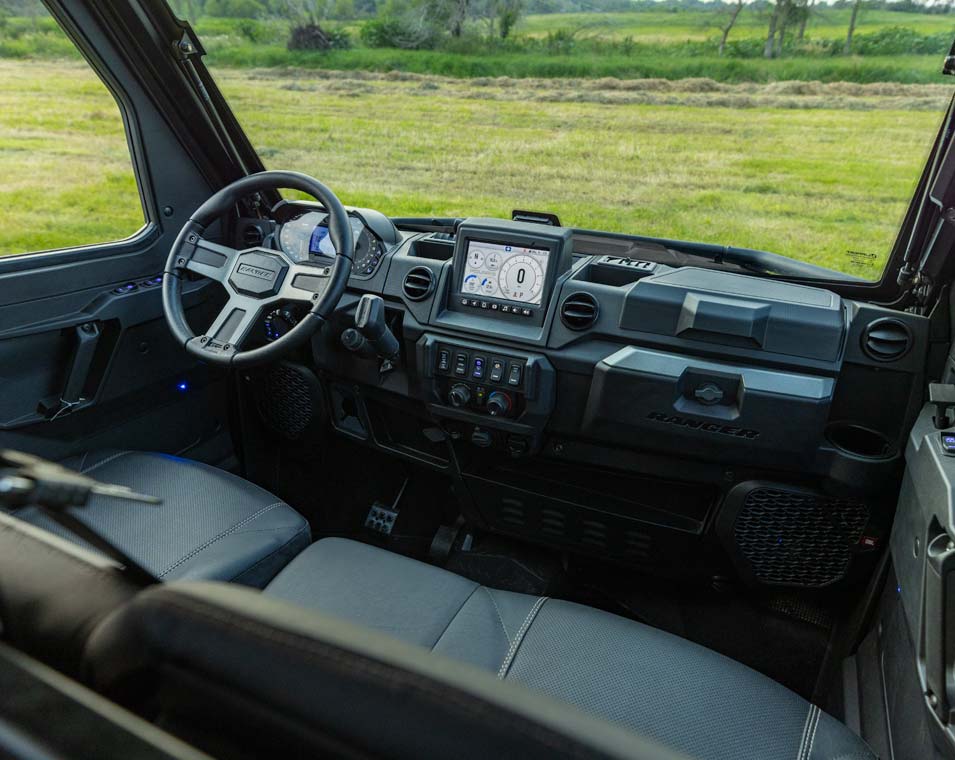 - Premium Pro-Shield Cab; Doors with Crank Windows; Fixed Glass Windshield with Wiper; Rear Glass Panel; Factory-Installed Heat, AC, Defrost; Rearview Mirror; Premium Steering Wheel and Interior Accents; NorthStar Tailgate Badge; Front Bumper with Integrated Winch, Plow & LED Mounts; Premium Cut & Sew Seats with Contoured Seatbacks and Embroidered Polaris Branding; Polaris HD 4500 lb Synthetic Rope Winch with Autostop and Wireless Remote; Polaris Pulse Electrical System (6-Position) Underhood Busbar and 6-Position Roof Busbar; 12V Accessory Outlet; Battery Trickle-Charging Outlet; USB Outlet, Factory-installed cab system with powered doors, roof, glass tip-out windshield, glass rear panel, rearview mirror, windshield wiper/washer, and sound insulation materials